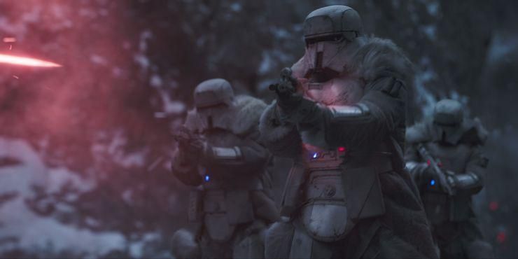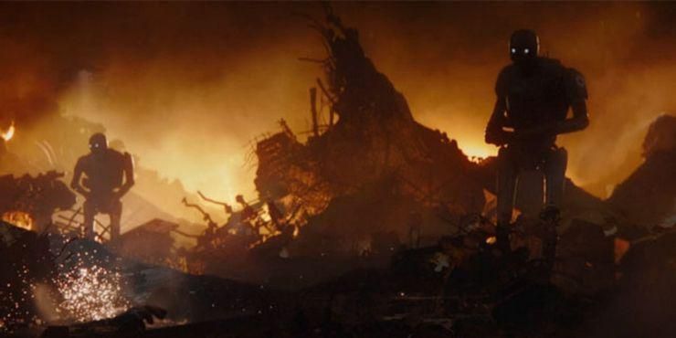 在一个明显是向《终结者》致敬的镜头中,曼达洛燃烧的场景被一群帝国机器人扫得一干二净。在地面上,有KX安全机器人(《侠盗一号》中的),在空中漂浮的是探测机器人——和达斯·维达用来搜索霍斯雪原的型号一样。